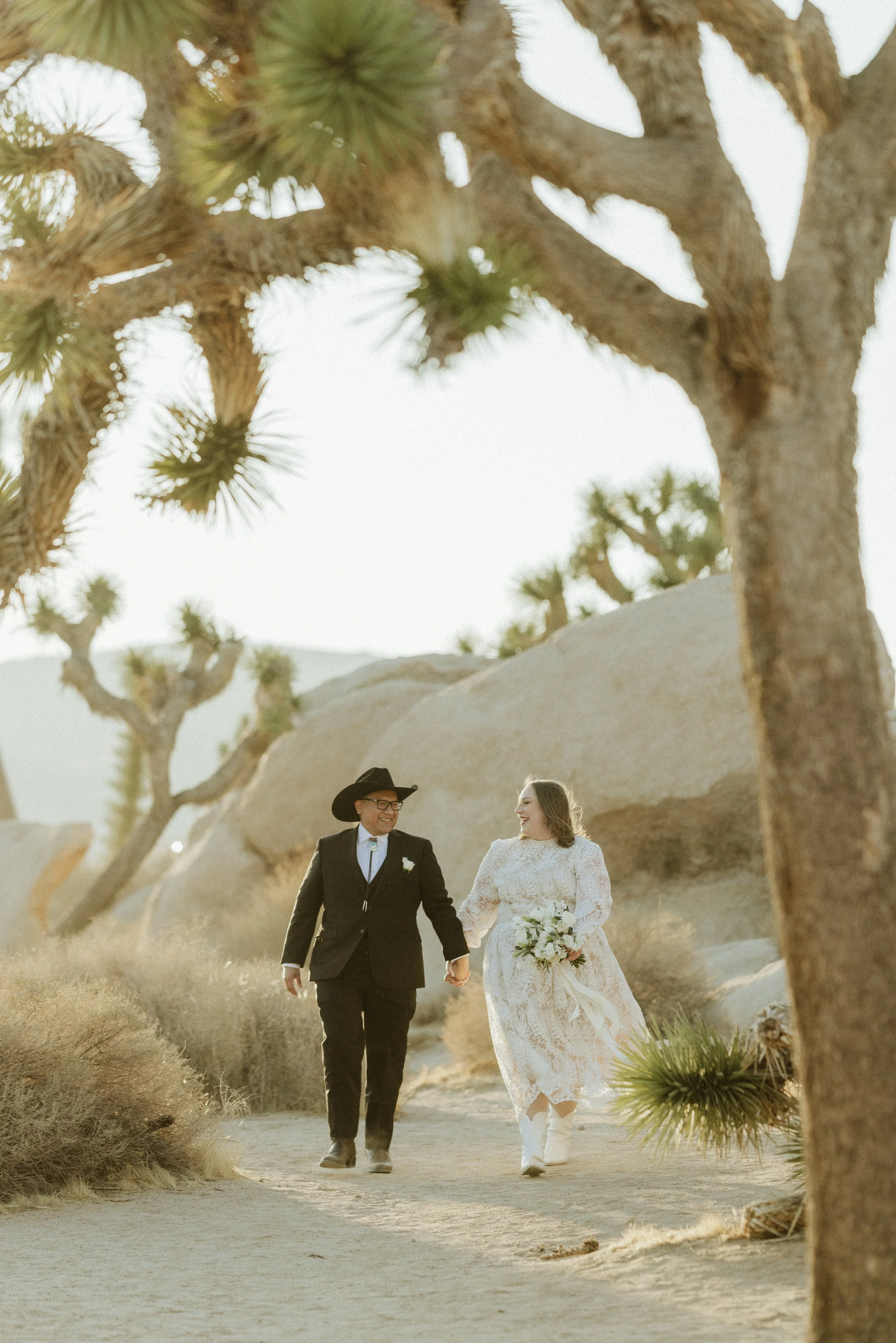 A bride and groom walking hand in hand through a desert landscape with Joshua trees and large boulders.