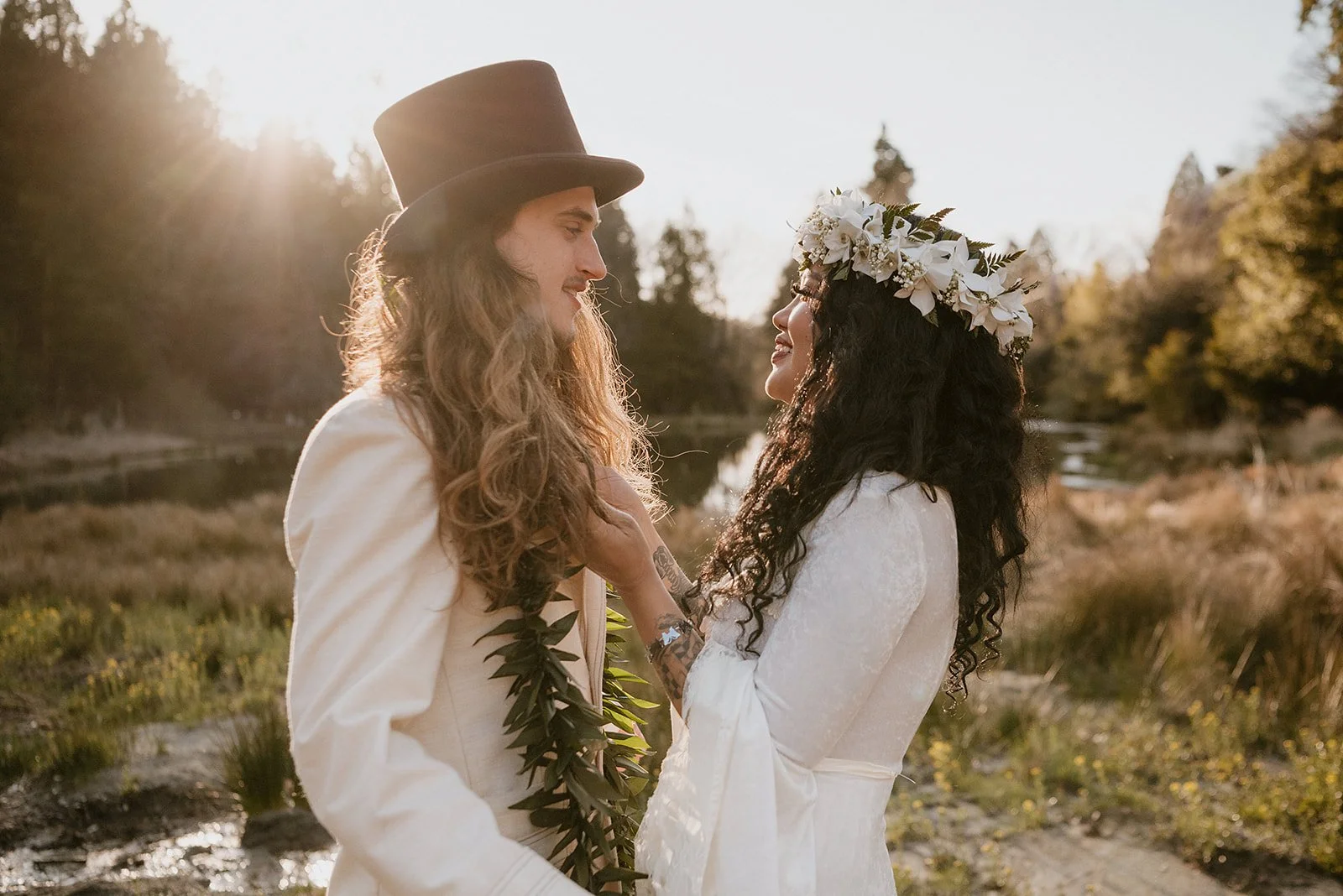 A woman and man with long hair, wearing wedding attire, standing close by a river during sunset, with the woman wearing a flower crown and the man wearing a top hat.